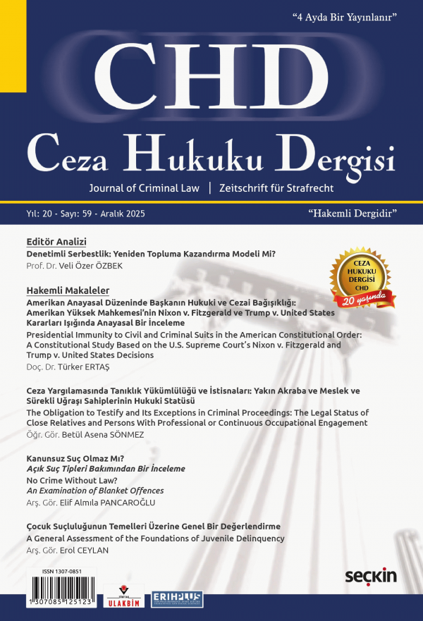 | Ceza Hukuku Dergisi 2025 Sayı-59 Denetimli Serbestlik : Yeniden Topluma Kazandırma Modeli mi? / | Ceza Hukuku Dergisi 2025 Sayı-59 Amerikan Anayasal Düzeninde Başkanın Hukuki ve Cezai Bağışıklığı: Amerikan Yüksek Mahkemesi’nin Nixon v. Fitzgerald ve Trump v. United States Kararları Işığında Anayasal Bir İnceleme / | Ceza Hukuku Dergisi 2025 Sayı-59 Ceza Yargılamasında Tanıklık Yükümlülüğü ve İstisnaları: Yakın Akraba ve Meslek ve Sürekli Uğraşı Sahiplerinin Hukuki Statüsü / | Ceza Hukuku Dergisi 2025 Sayı-59 Kanunsuz Suç Olmaz mı? / | Ceza Hukuku Dergisi 2025 Sayı-59 Çocuk Suçluluğunun Temelleri Üzerine Genel Bir Değerlendirme / | Ceza Hukuku Dergisi Ağustos 2024 Sayı-55 Dokuzuncu Yargı Paketinde Yer Alan Ceza Hukukuna İlişkin Hükümlerin Değerlendirilmesi / | Ceza Hukuku Dergisi Ağustos 2024 Sayı-55 Kişinin Kendisini ve Yakınlarını Suçlamaya Zorlanamaması (Nemo Tenetur Se Ipsum Accusare) İlkesi / |